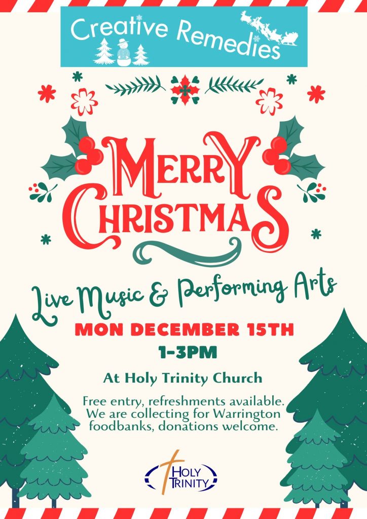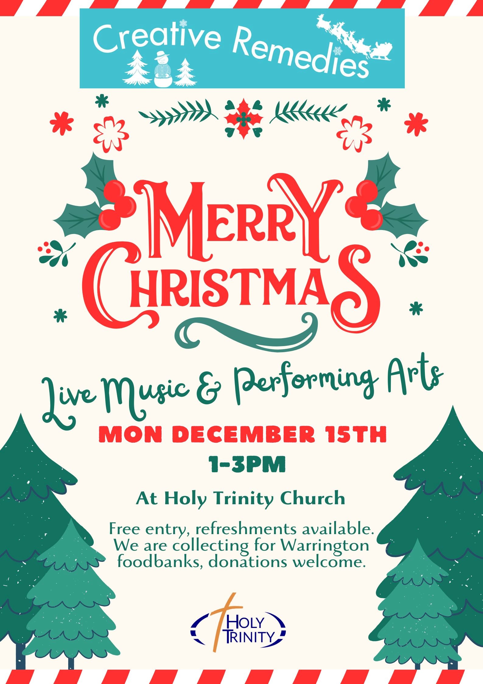 Creative Remedies Christmas Event Date December 8, 2025 Time 1:00 pm – 3:00 pm Venue Holy Trinity Church Everyone is welcome to join us for Creative Remedies’ Christmas event with live music and performing arts at Holy Trinity on Monday December 15th from 1.00 p.m. -3.00 p.m.