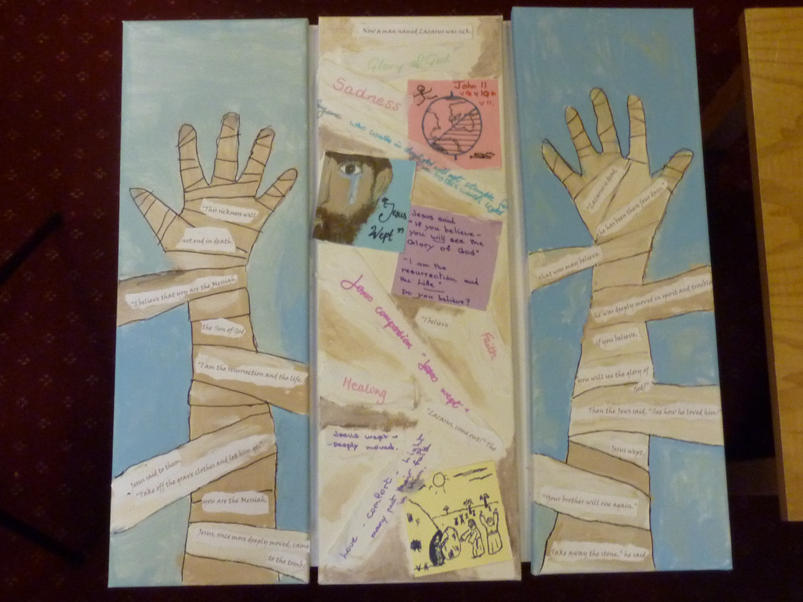 We are excited to announce the launch of our Trinity Together service on the first Sunday of the month. Everyone starts the service together. We will then split into three groups to study the same theme in three learning styles.For those who would rather sit and listen there will still be a sermon in the main body of the church. The other two learning zones may vary. The learning zone options for our first two Trinity Together services have so far have included a discussion group in the Montgomerie room and a Messy church in the Garven room where the theme will be explored through craft activity. The first Trinity together service was in March and looked at the Transfiguration of Jesus, the April Trinity together was on Lazarus.